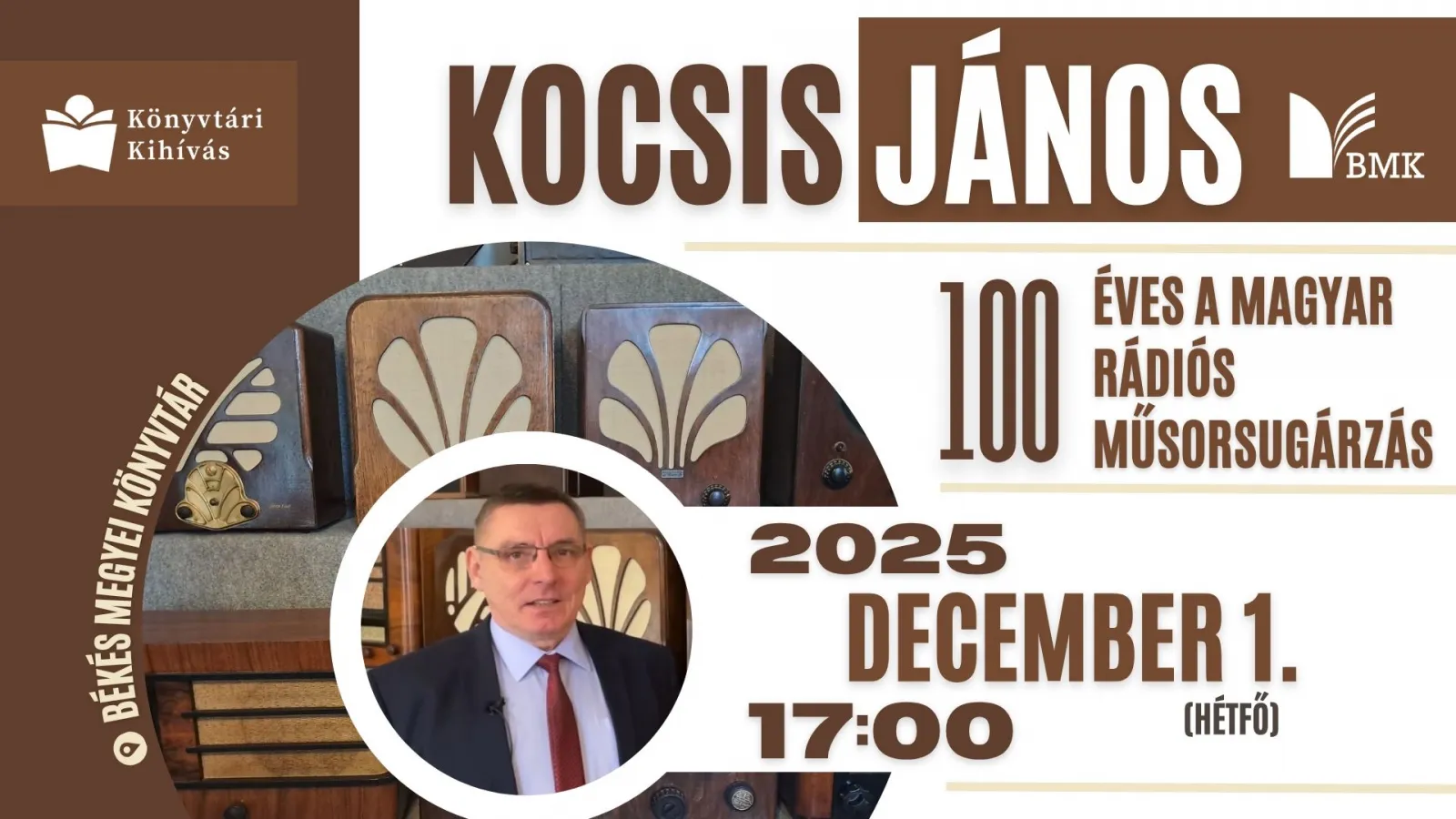 100 éve, 1925. december 1-jén kezdődött a rendszeres rádiós műsorsugárzás Budapesten. Erről a múltbéli nagy jelentőségű technikatörténeti eseményről, ennek előzményeiről és a magyar rádiógyártás hőskoráról tart vetítéses előadást Kocsis János idegenvezető a Békés Megyei Könyvtárban.