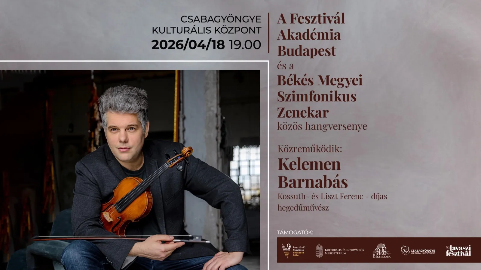 Közreműködik: Kelemen Barnabás Kossuth- és Liszt Ferenc - díjas hegedűművész; Vezényel: Rázga Áron