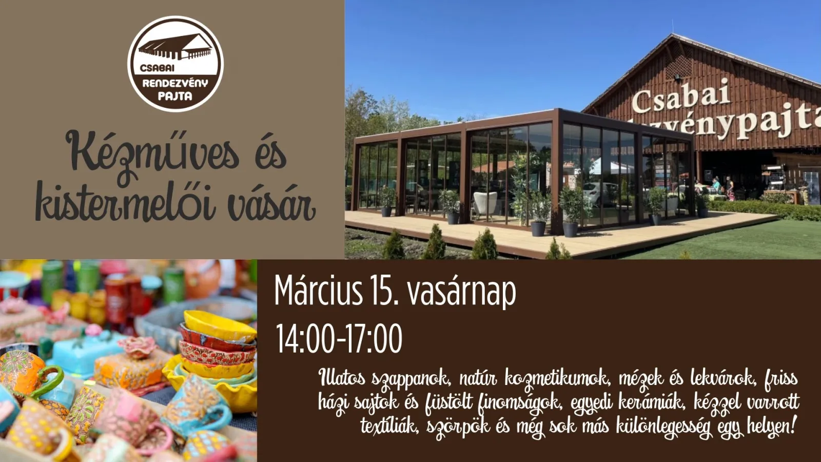 Várnak az illatos kézműves szappanok, natúr kozmetikumok, termelői mézek és lekvárok, friss házi sajtok, füstölt finomságok, különleges kerámiák, kézzel készült textíliák, szörpök és még sok más egyedi portékák.