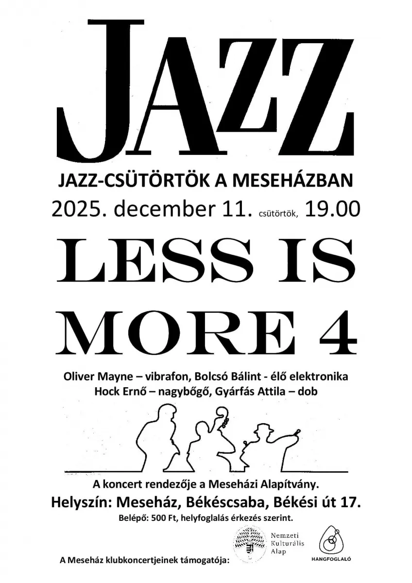 A Less Is More trió több mint tizenöt éve meghatározó formációja a budapesti szabadzenei szcénának. Az együttes neve Bolcsó Bálint elektronikájának hozzáadásával Less Is More 4-re módosult, és Gyárfás Attila nemrégiben váltotta le az alapító dobost, Sárvári Kovács Zsoltot. Az alapkoncepciójuk változatlan: totális improvizáció. A vibrafon, a nagybőgő és az akusztikus dobok 100%-osan spontán módon létrehozott hangjait Bolcsó élőben és valós időben manipulálja effektarzenáljával, műfaji határokat feszegető atmoszférikus hangzásvilágot teremtve. Jövő-dzseszz a legmagasabb szinten!