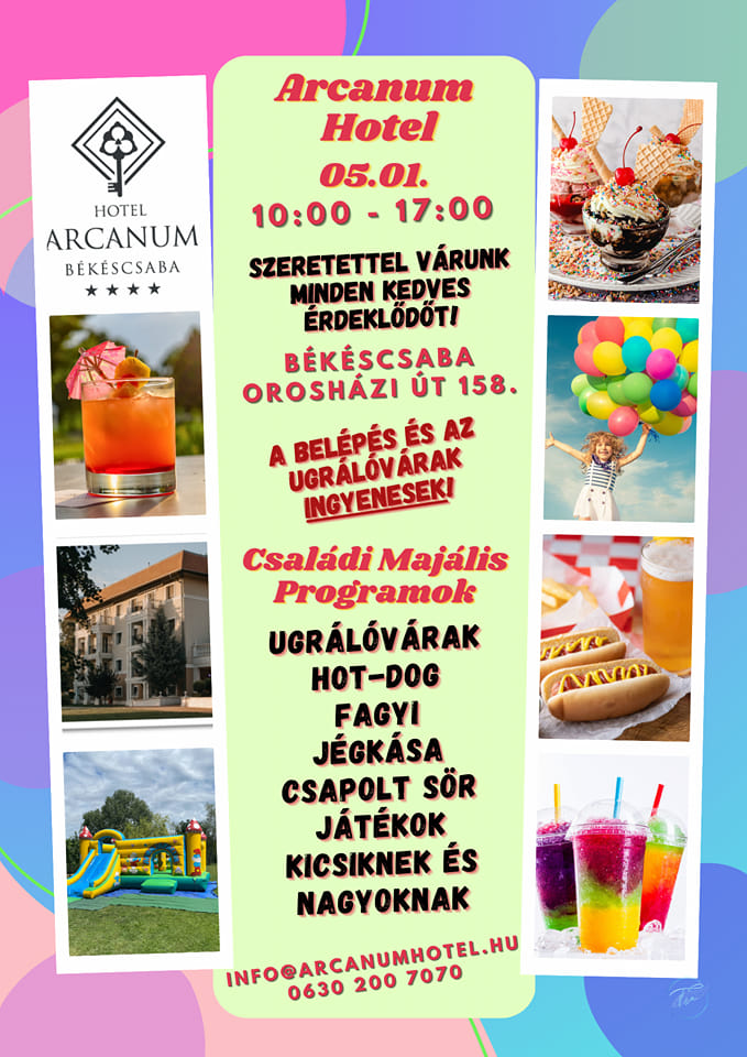 Kültéri játékokkal, rengeteg finomsággal várják a családokat az Arcanum Hotel Majálisán! A rendezvény és az ugrálóvárak használata is ingyenes.