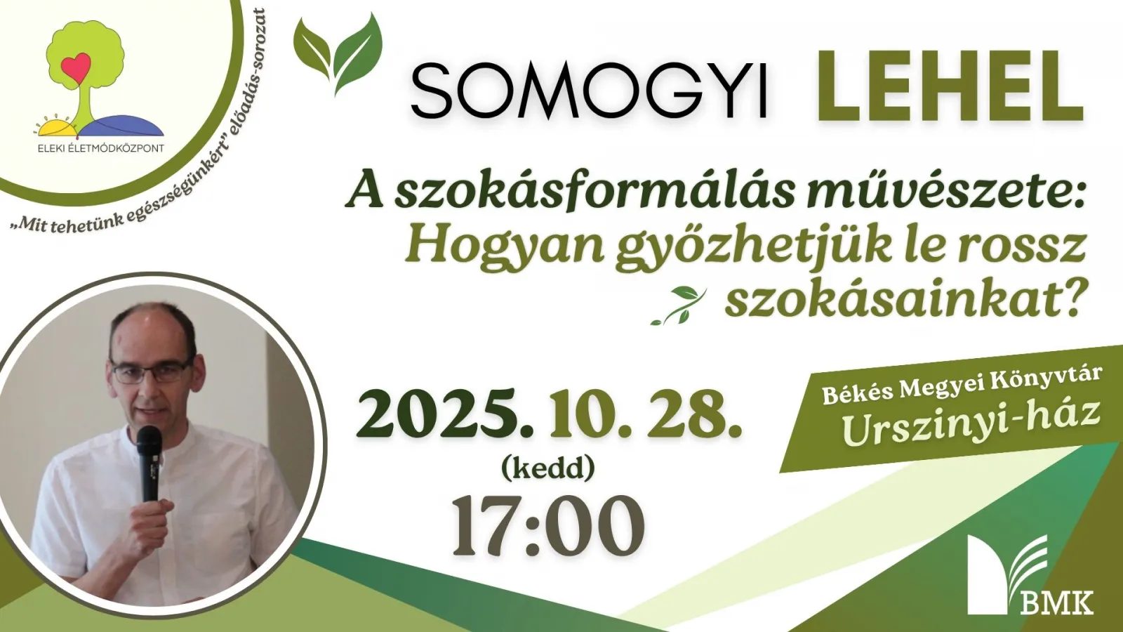 Somogyi Lehel, az Eleki Életmódközpont intézményvezetője A szokásformálás művészete: Hogyan győzhetjük le rossz szokásainkat? címmel tartja meg szemléletformáló előadását.