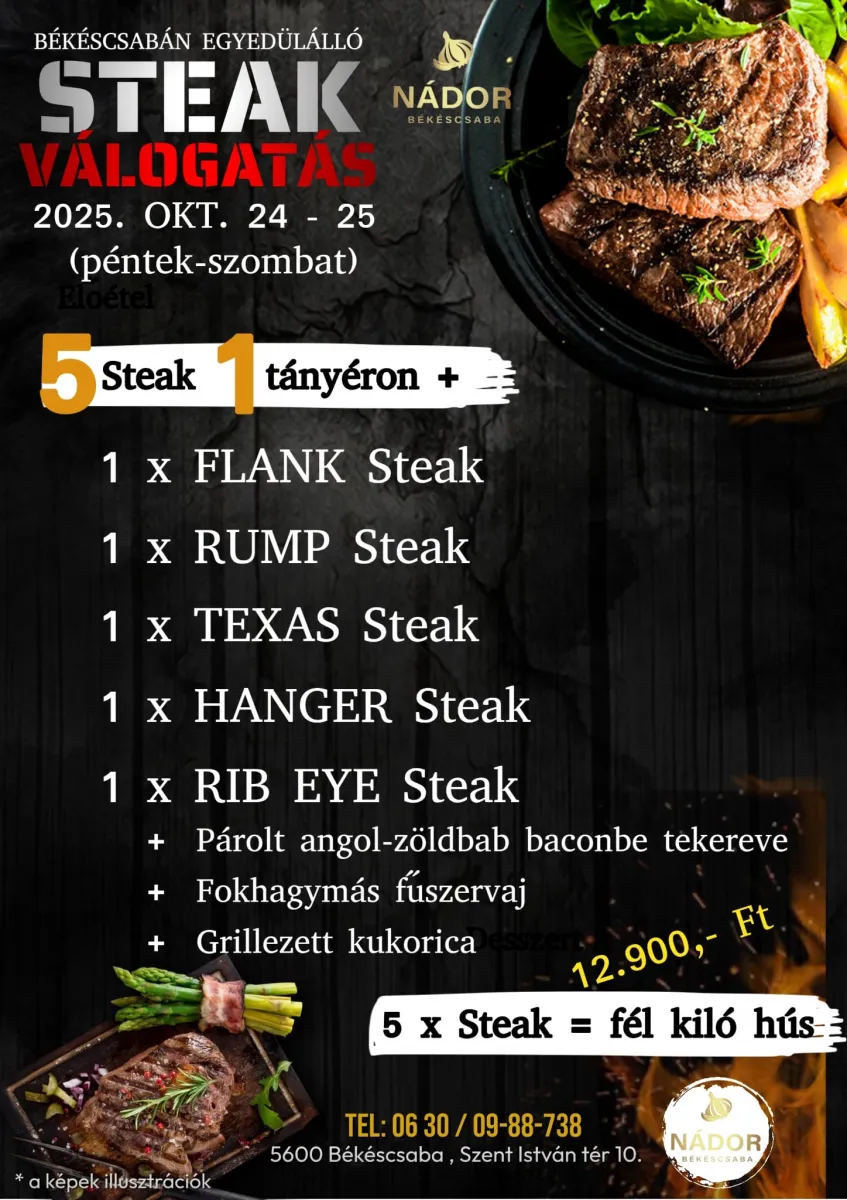 A Nádor Étterem a húsrajongókat várja különleges steak válogatással ezen a hétvégén. Ez egy remek alkalom arra, hogy kipróbáljon többféle steaket egyetlen alkalommal. Előrendelést is felvesznek.