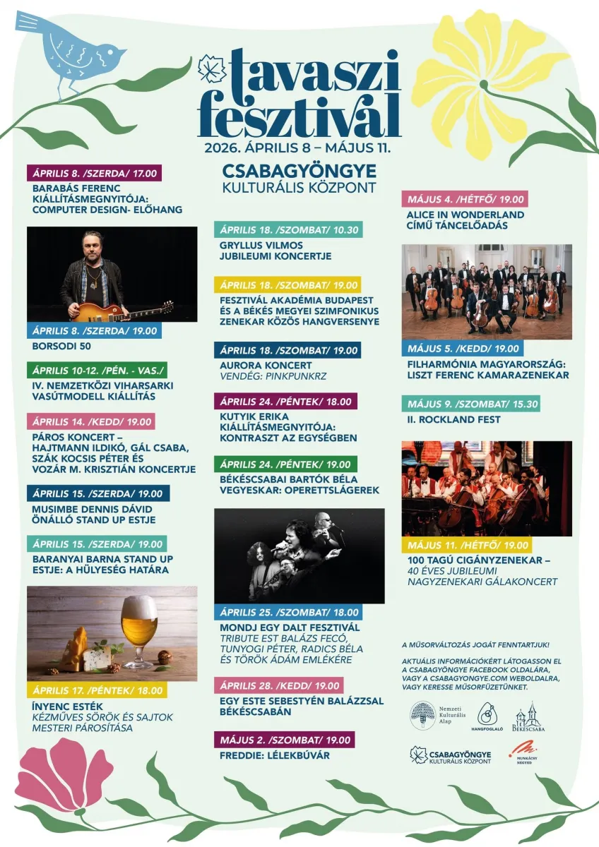 Április 8-ától május 11-éig tart a Tavaszi Fesztivál Békéscsabán!Egy hónapon át kulturális programkavalkád várja a Csabagyöngye Kulturális Központban és tagintézményeiben a látogatókat.